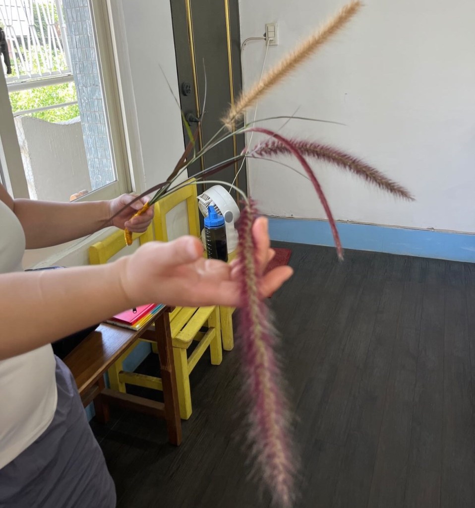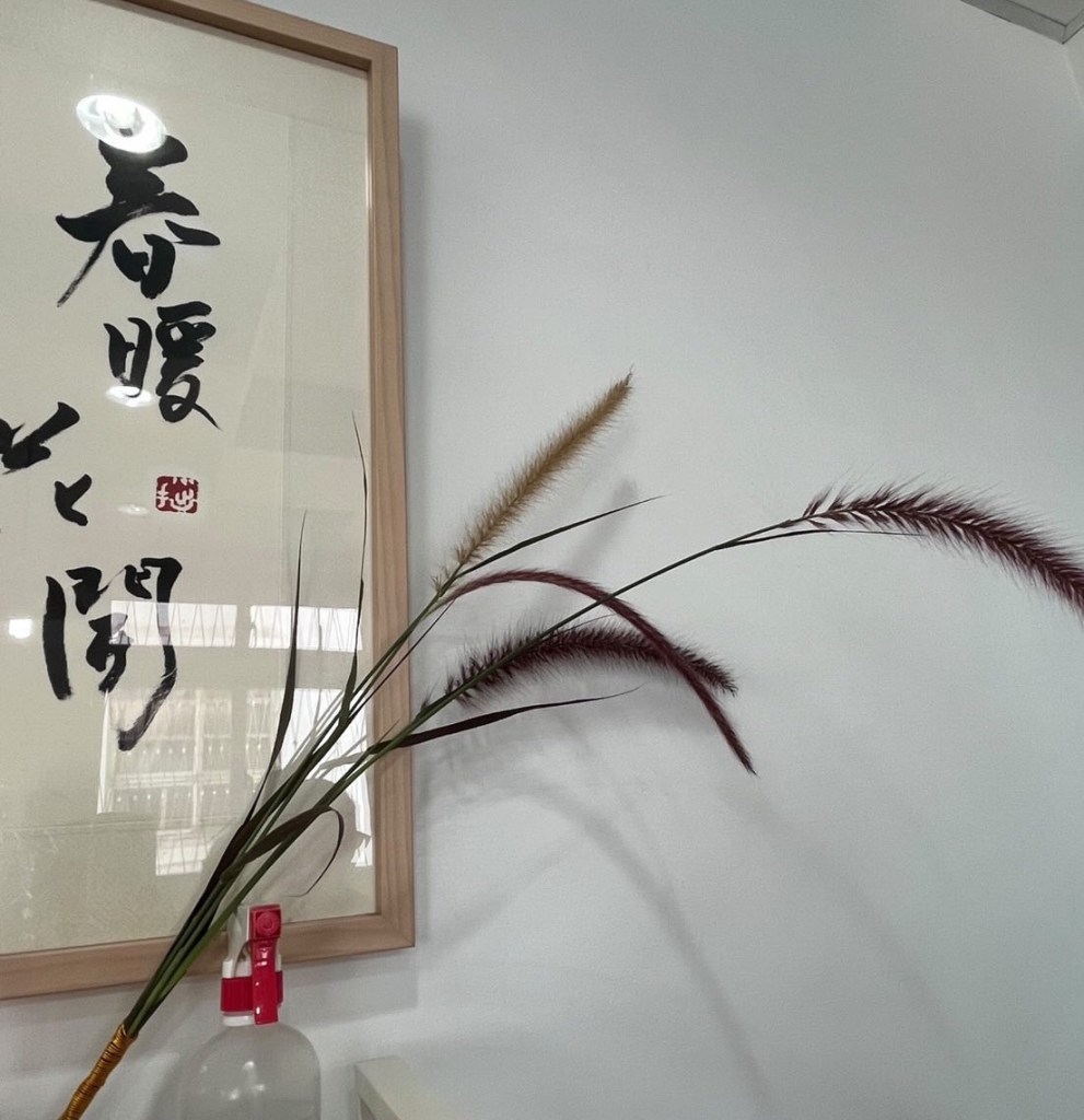 在創作的過程當中,夥伴們是三三兩兩的聚在一起邊聊邊創作的,我自己完成了狼尾草花束之後,就開始在畫室的空間裡尋找適合擺放的位置,上下顛倒、兜來轉去,最後停留在牆上的書法字帖旁邊,小寶問我為什麼最後停到這個位置,我講著講著,突然間覺得,我自己就像這狼尾草花束,尋尋覓覓著,為自己在既定的空間範圍裡,找到我與他人都能各自安好的位置。